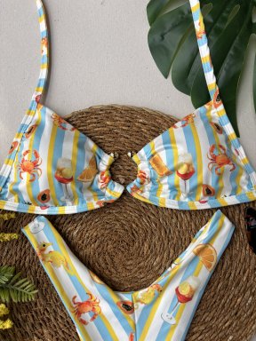 Com estampa exclusiva que mistura listras em tons de azul e amarelo com elementos tropicais como frutas, drinks e detalhes marítimos, ele entrega um visual alegre, sofisticado e irresistível.